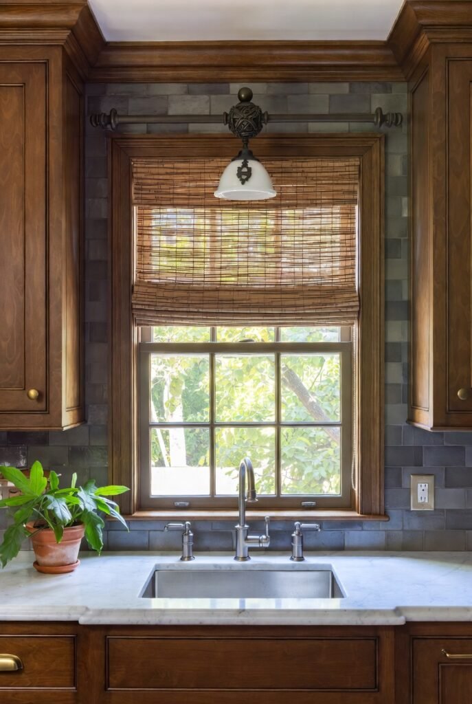 A woven bamboo shade paired with a vintage-style wall sconce gives this kitchen sink area a warmth that feels genuinely cozy.