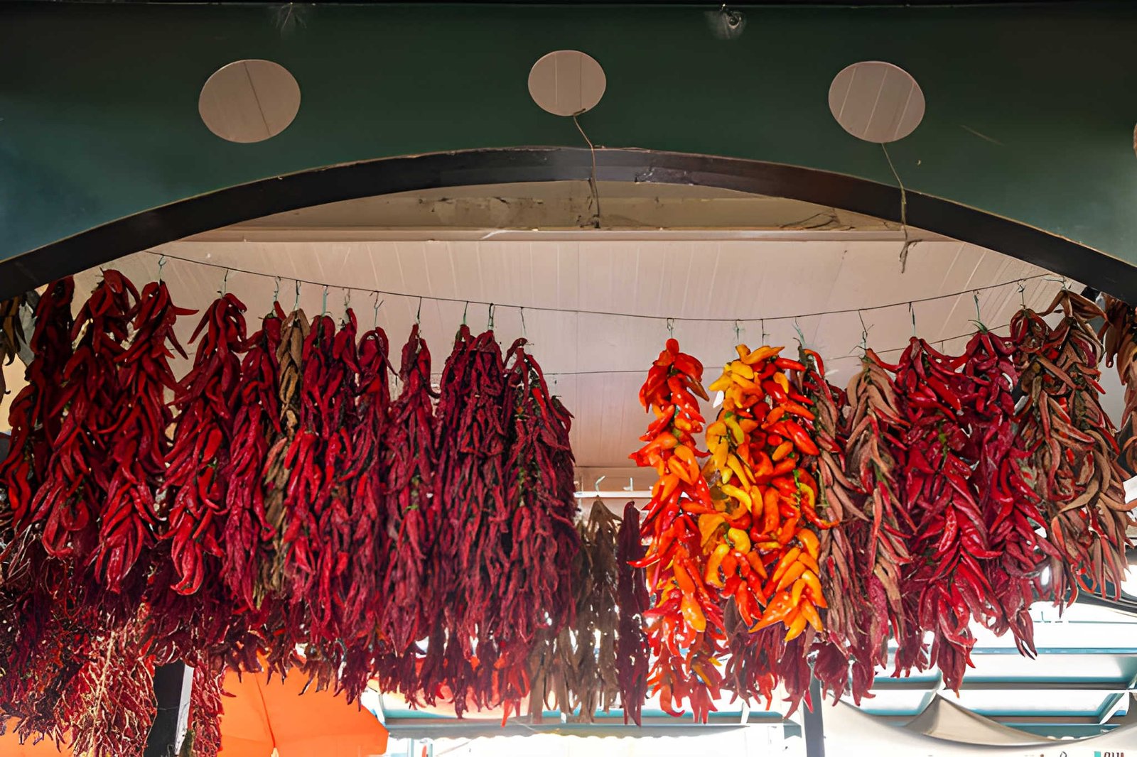 Dried chiles hanging from the ceiling add authentic character and a touch of spice.