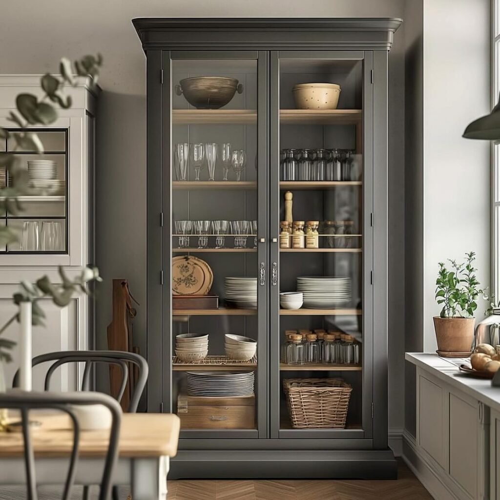 Painted in deep charcoal with warm wooden shelf inserts, it strikes that perfect balance between heavy and airy. Stacked plates, stemware, glass jars, and a wicker basket fill every shelf thoughtfully — nothing random, everything purposeful.