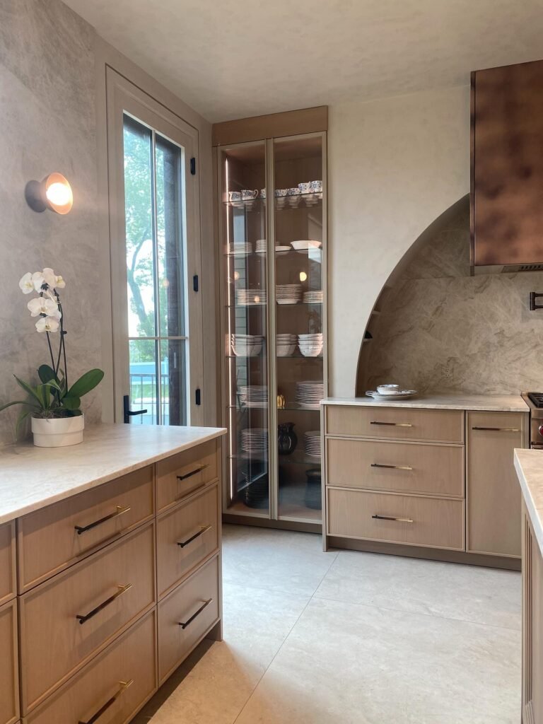 5. Warm Neutral Kitchen with Glass Display Cabinet