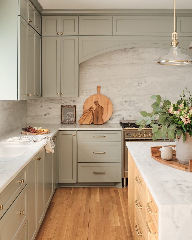 The sage green shaker cabinets with brass hardware have that timeless English cottage quality that never gets old.