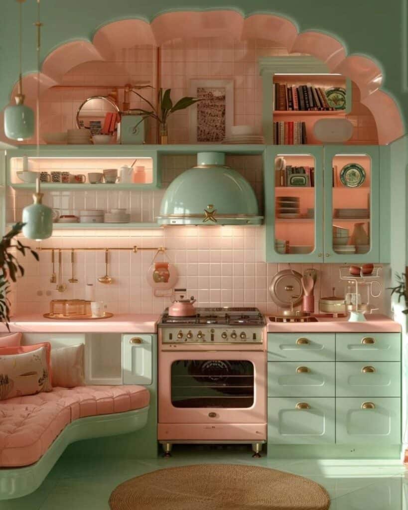The mint and blush combination somehow works, feeling more vintage Parisian café than over-the-top.