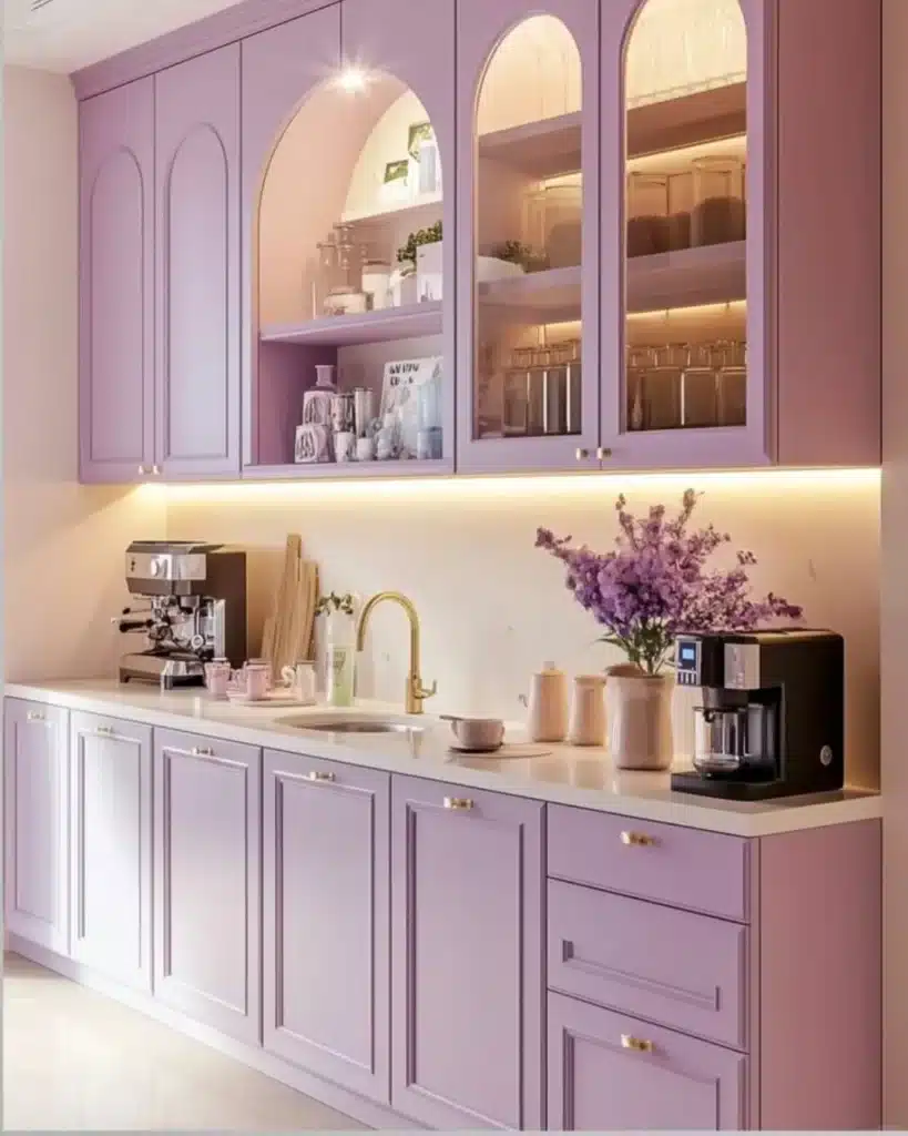 Lavender cabinetry with arched glass cutouts — this combination is softer than pink and more interesting than plain grey.