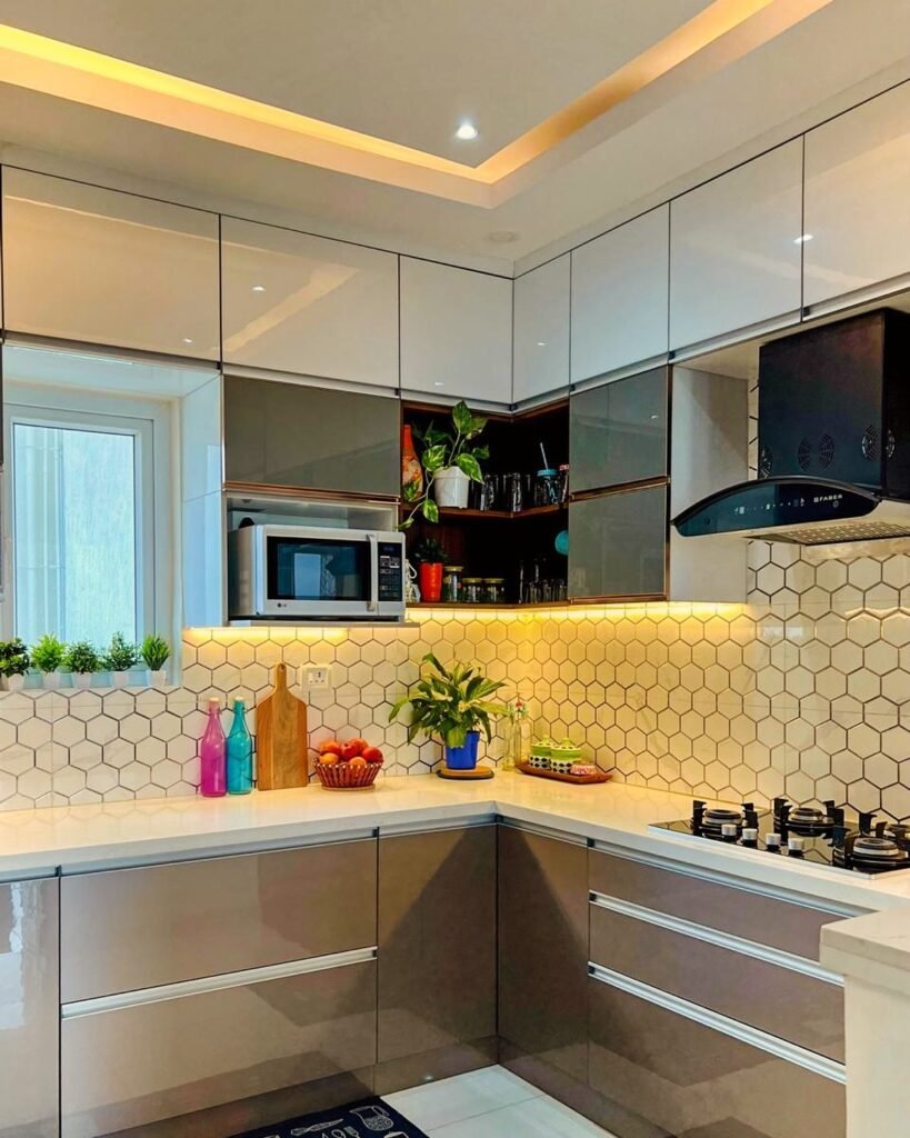 11. Glossy Modular Kitchen with Hexagon Backsplash