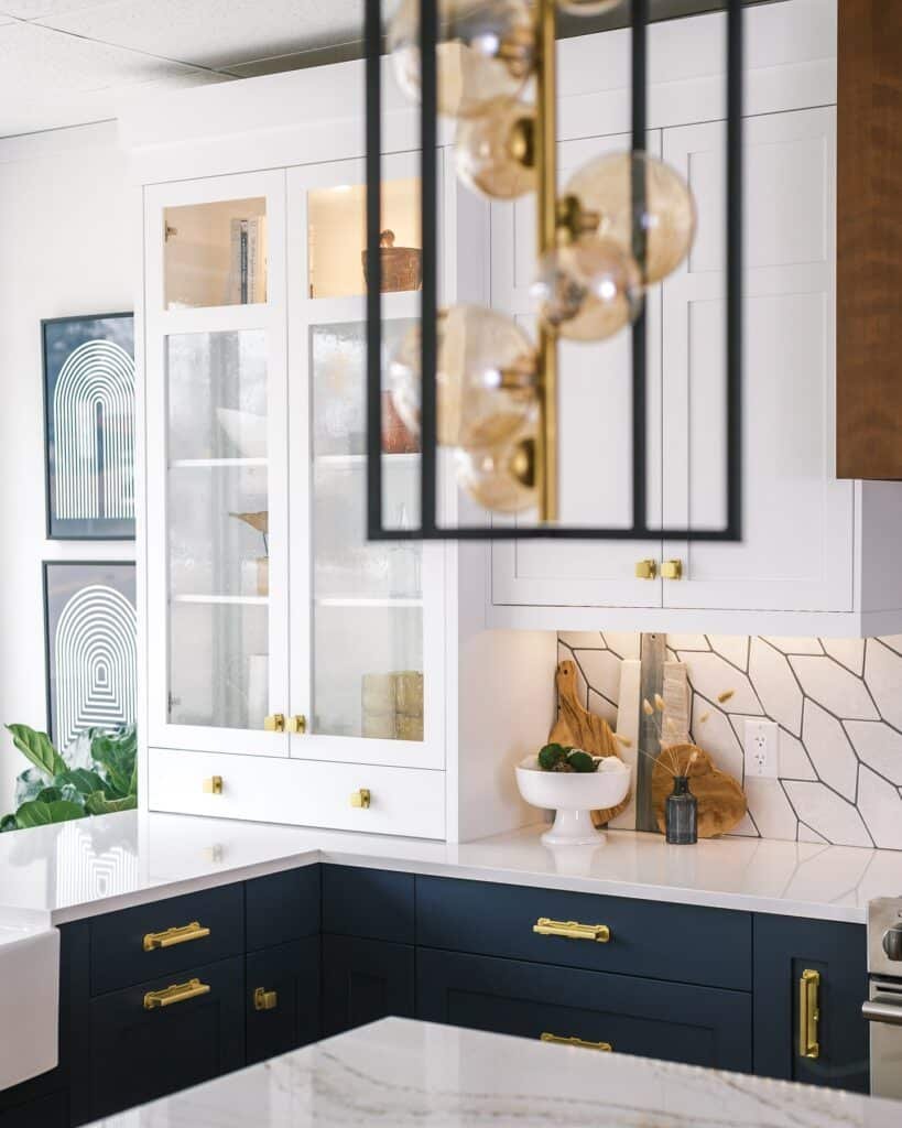 The white uppers with glass-front doors and the deep navy lowers create a dramatic contrast that feels both classic and fresh.
