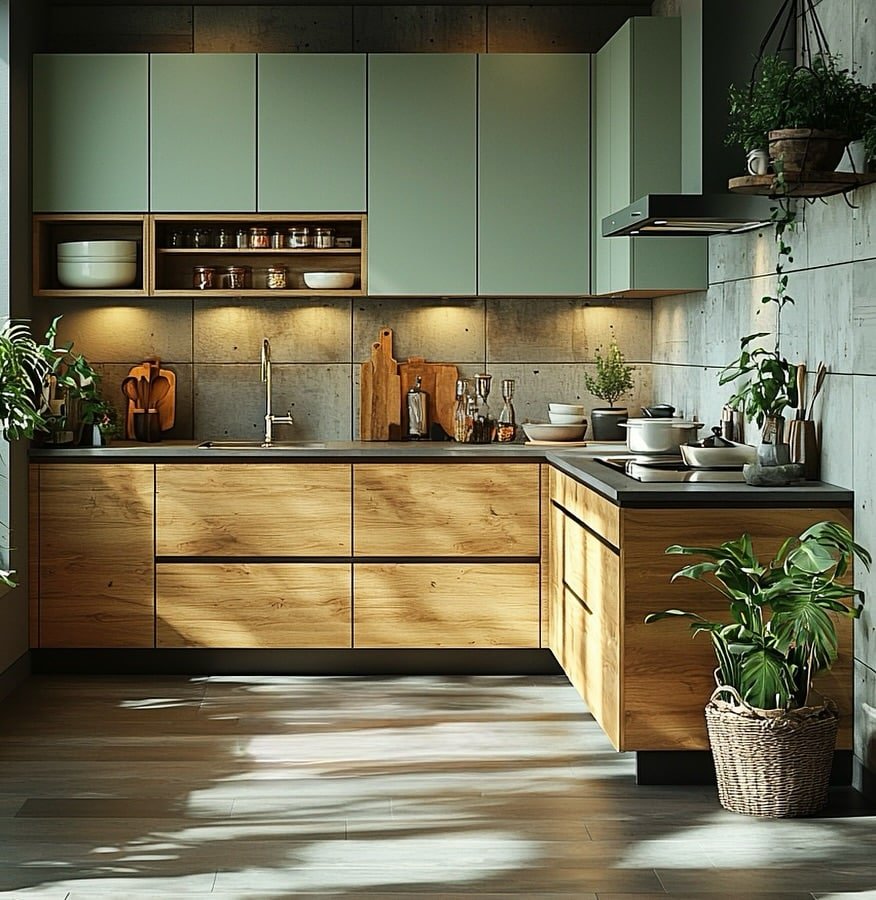 The upper sage cabinets are left clean and handleless, which is a smart modern choice, while trailing greenery from hanging baskets softens the whole space from above.