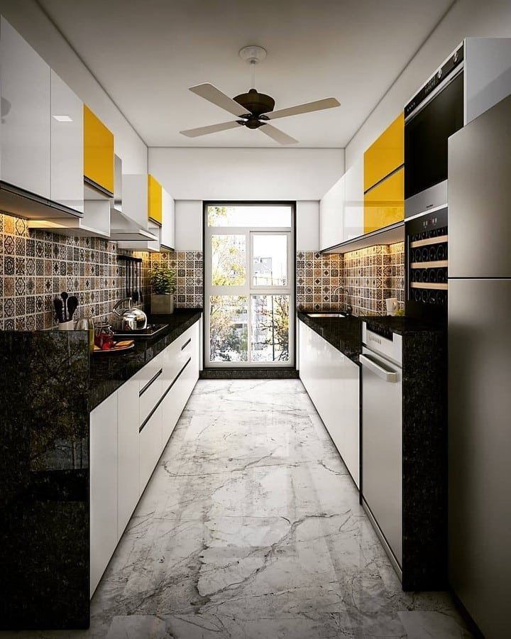 This parallel kitchen layout squeezes in so much personality through color blocking alone.